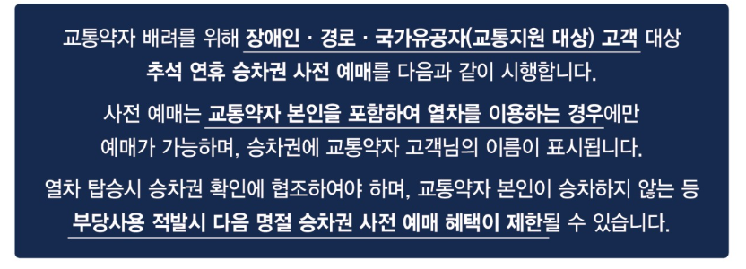 - 사전예매는 반드시 본인 이용이 원칙, 부당 사용 시 다음 명절 사전예매 제한 가능